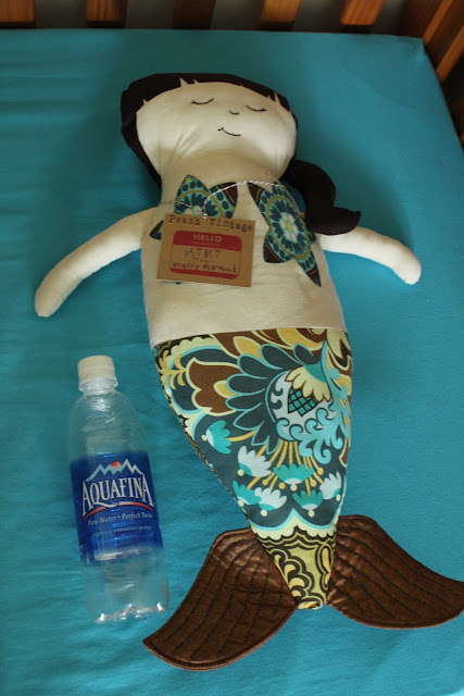 As some of you may already know, I love etsy!  There are so many great things to be found there.  Peach Vintage is one of the shops you can find on etsy.  Heather, Owner/Operator of Peach Vintage makes some great items, two of which I recently recieved to review.  First is Kiki the Merry Mermaid.  Because I love the beach and ocean, I LOVE mermaids!  Kiki is just adorable!!  Beautifully made and generously sized,  any girl is sure to love her very own Merry Mermaid.  The Merry Mermaids are an original design by Heather.  She made her first Merry Mermaid as a gift for her friends daughter.  They come in a variety of styles featuring different fabrics and colors.  Kiki has brown hair, and a beautiful tail.  I love the fabric and colors she is made of.  Very fun!